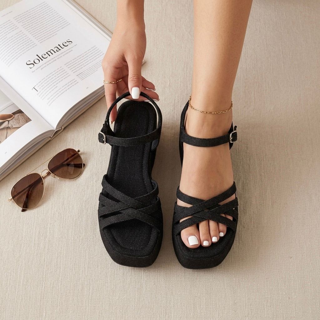 Huaraches color negro para mujer, material sintético resistente, sandalia de plataforma con tiras, modelo ligero, moda casual urbana.