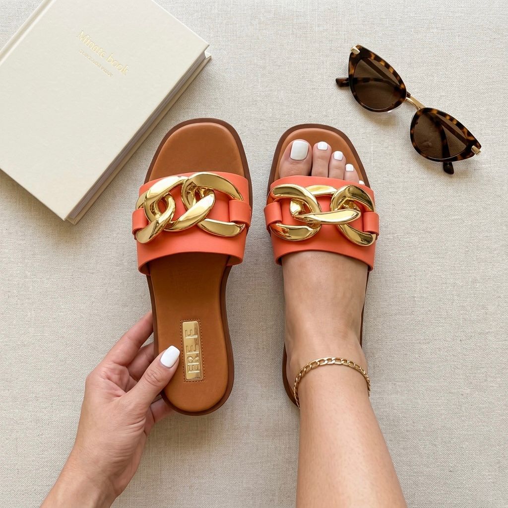 Huaraches color naranja para mujer, material sintético, sandalia tipo slide con cadena, modelo ligero, moda minimalista elegante.