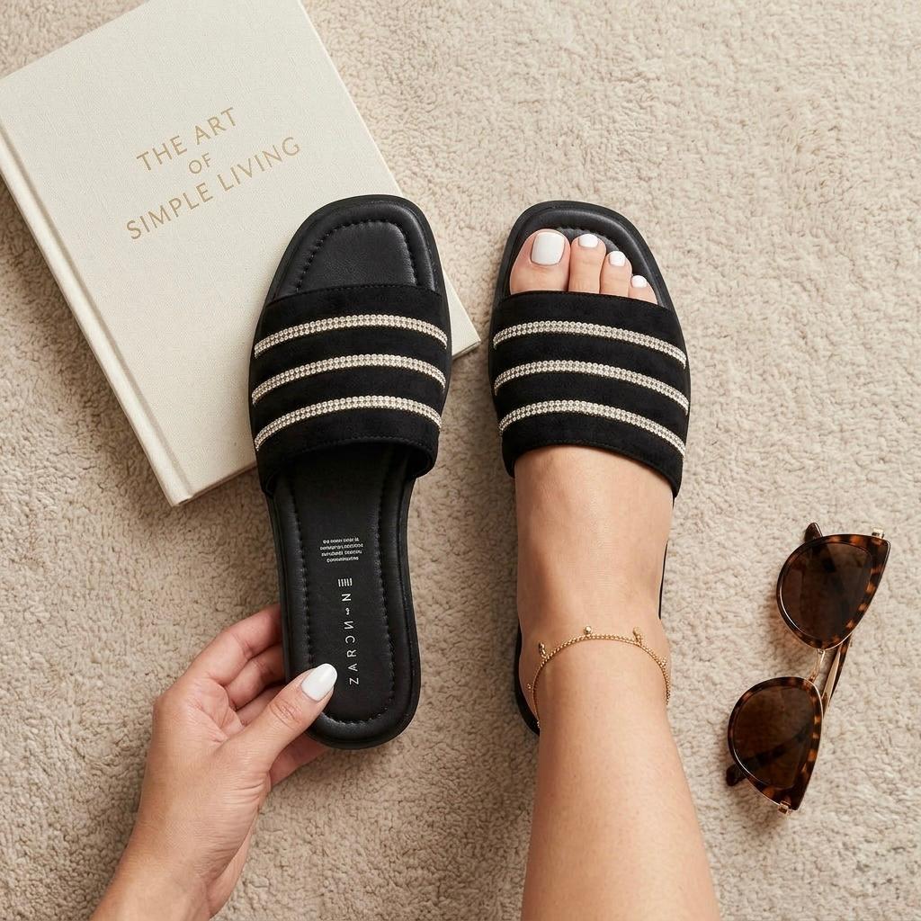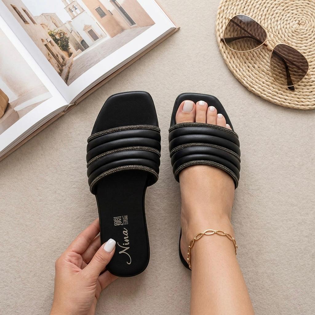 Huaraches color negro para mujer, material sintético, sandalias planas tipo slide con tiras decoradas con brillos, modelo ligero, moda minimalista elegante.