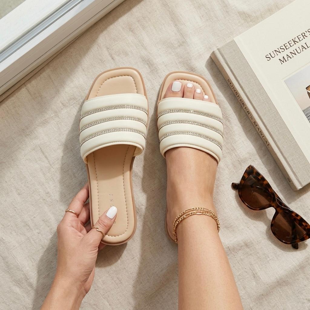 Huaraches color beige para mujer, material sintético, sandalia mule plana con detalles de tiras brillantes, modelo ligero, moda minimalista elegante.