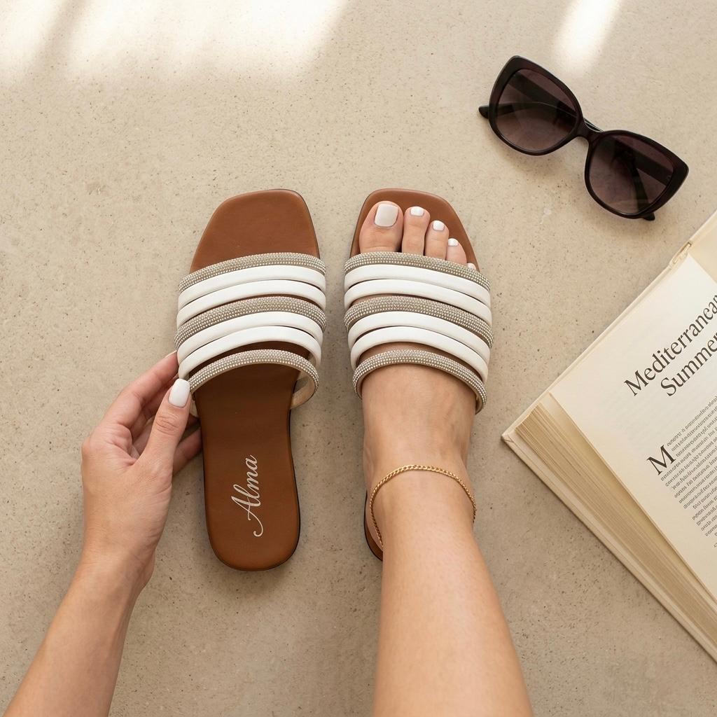 Huaraches color blanco para mujer, material sintético, sandalias planas tipo slide con tiras decoradas con brillos, modelo ligero, moda minimalista elegante.