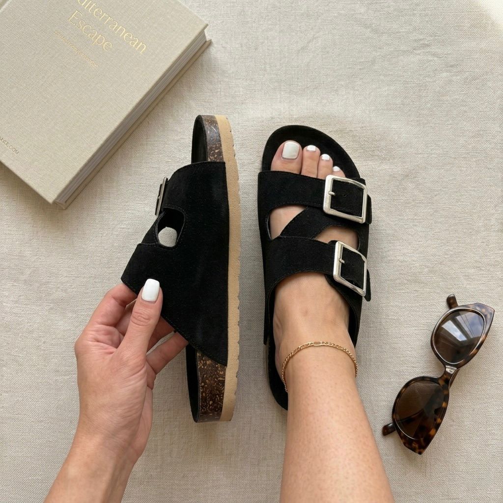Sandalias tipo slide de confort para mujer, textura durazno, con detalles de hebilla doble ajustable, suela plana sin tacón, modelo casual de piso estilo Birkenstock.