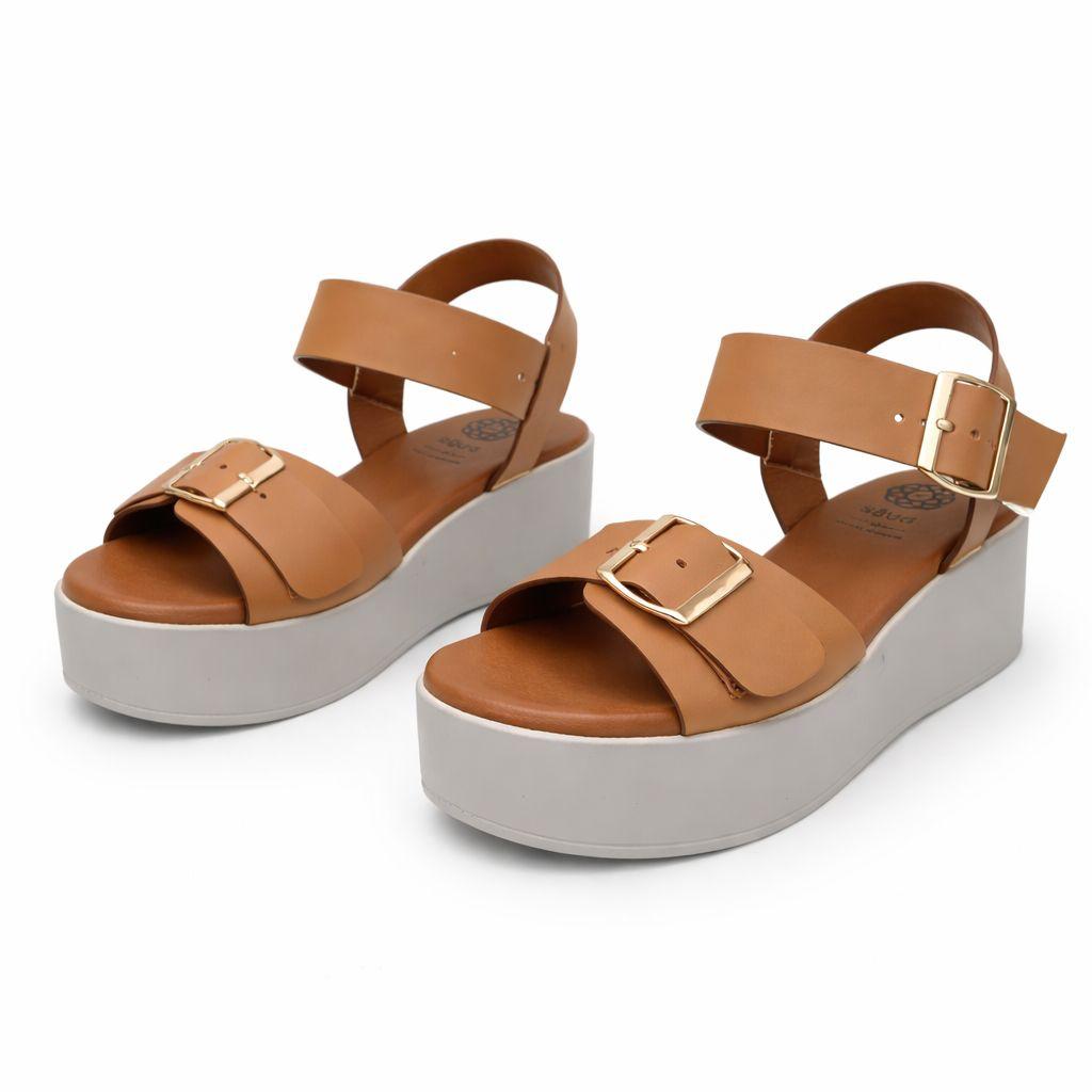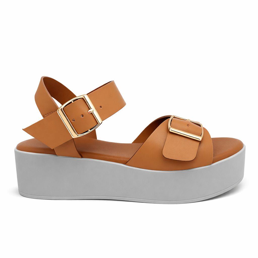 Huaraches color camel para mujer, material sintético resistente, plataforma con hebilla, modelo ligero, estilo casual, moda urbana.