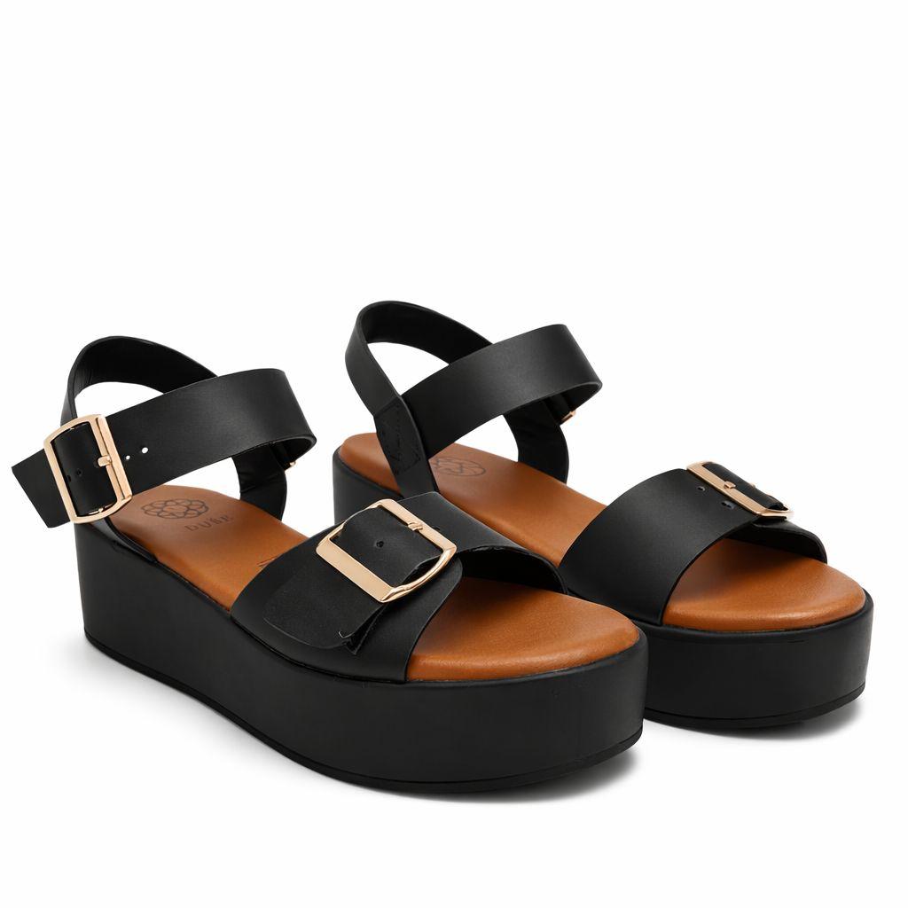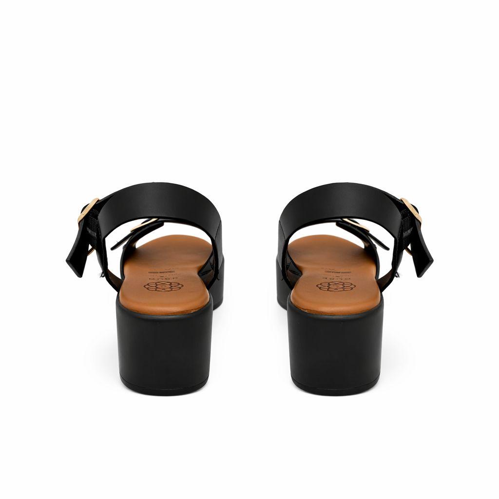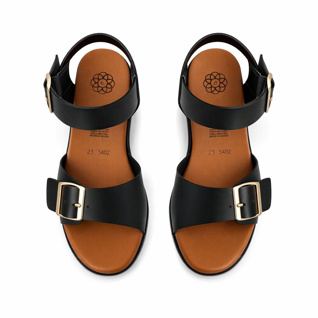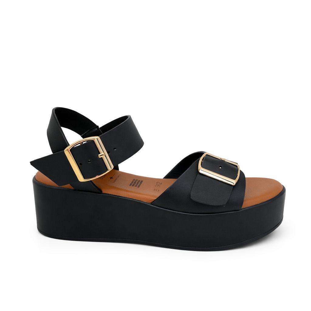 Huaraches color negro para mujer, material sintético resistente, plataforma con hebilla, modelo ligero, estilo casual, moda urbana.