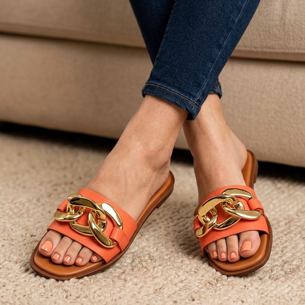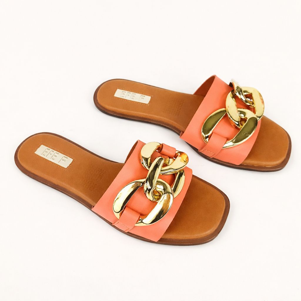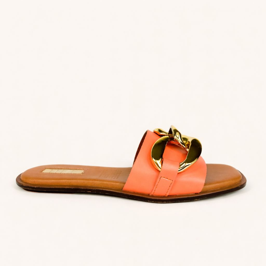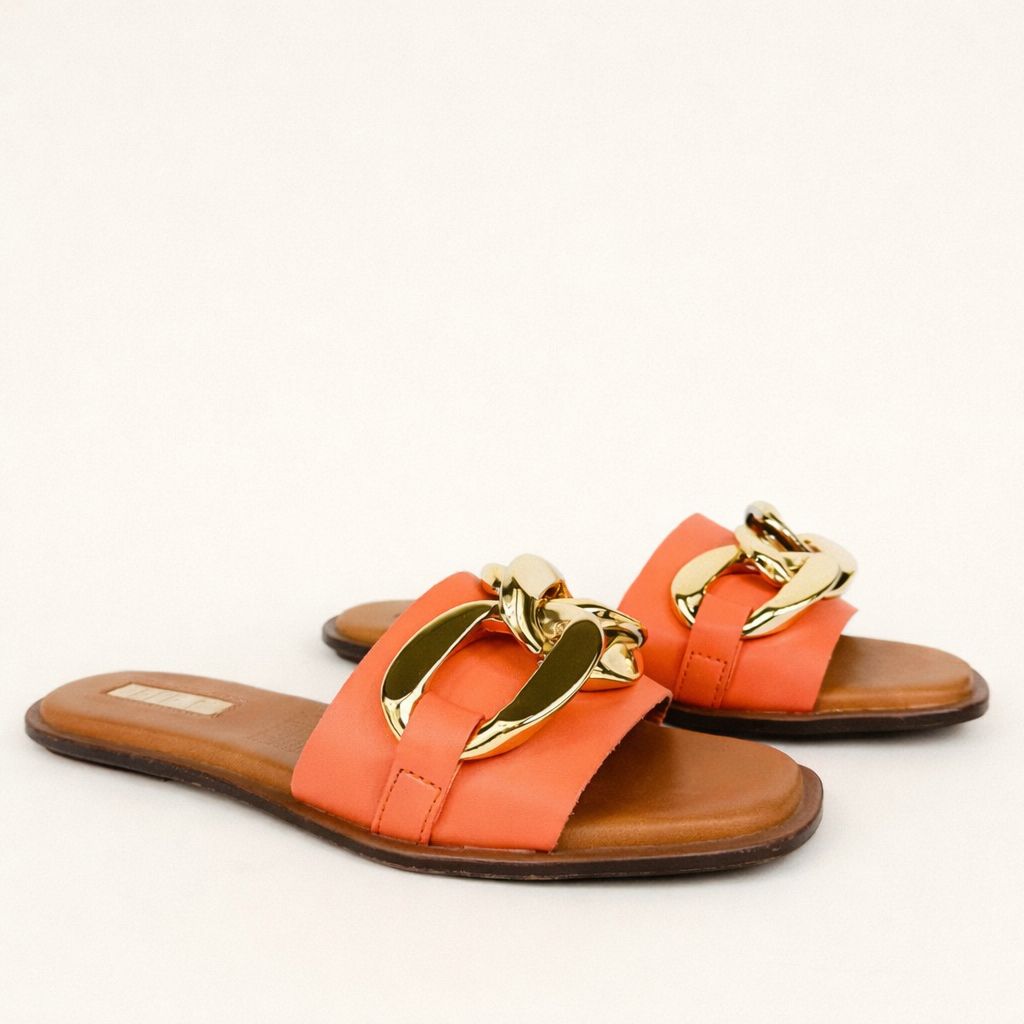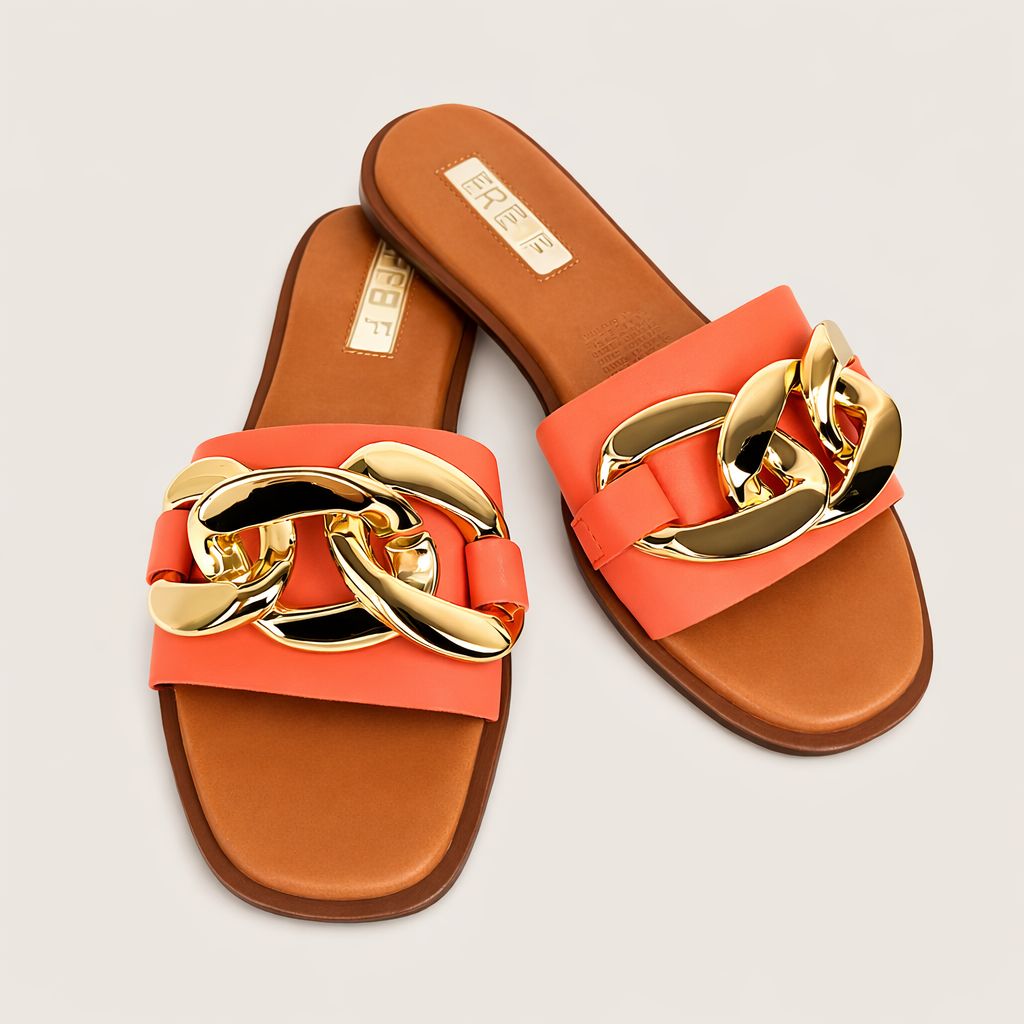 Huaraches color naranja para mujer, material sintético, sandalia tipo slide con cadena, modelo ligero, moda minimalista elegante.