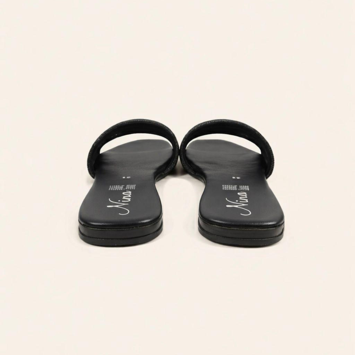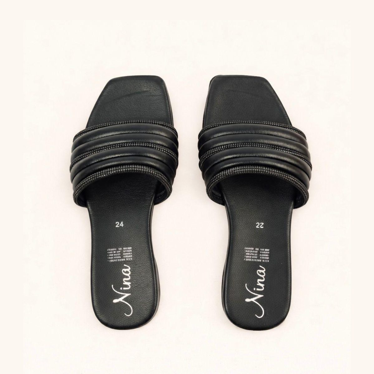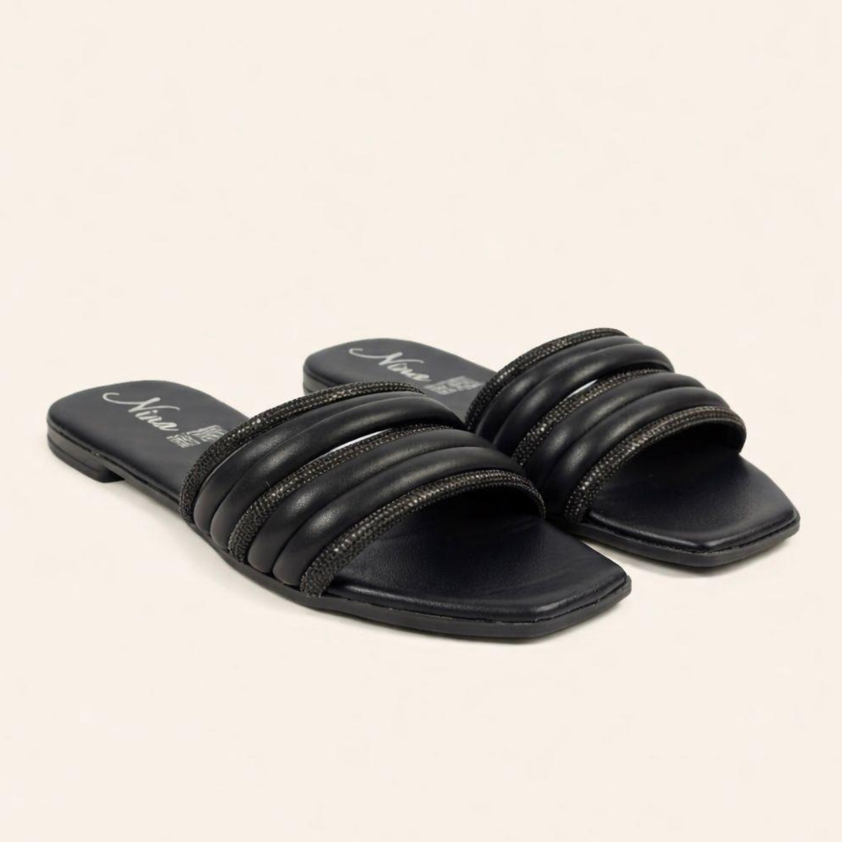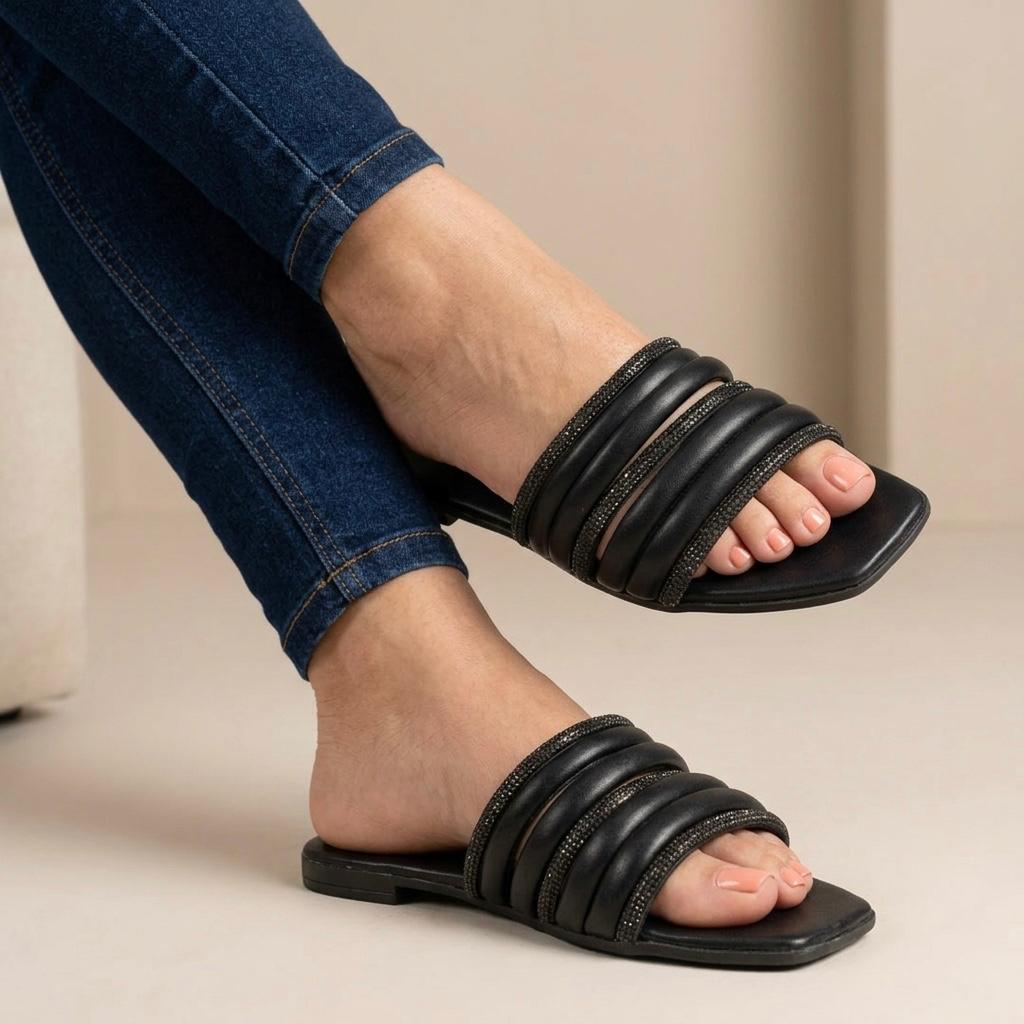 Huaraches color negro para mujer, material sintético, sandalias planas tipo slide con tiras decoradas con brillos, modelo ligero, moda minimalista elegante.